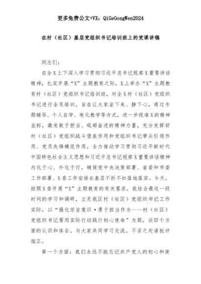 【七哥公文】2025年:在村(社区)基层党组织书记培训班上的党课讲稿+更多免费公文+VX:QiGeGongWen2024+更多免费公文+VX:QiGeGongWen2024