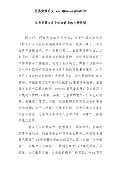 【七哥公文】2025年:在市委第x次全体会议上的主持讲话+更多免费公文+VX:QiGeGongWen2024+更多免费公文+VX:QiGeGongWen2024