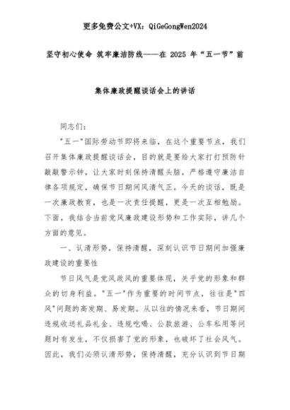 【七哥公文】2025年:坚守初心使命 筑牢廉洁防线——在 2025 年“五一节”前集体廉政提醒谈话会上的讲话+更多免费公文+VX:QiGeGongWen2024+更多免费公文+VX:QiGeGongWen2024