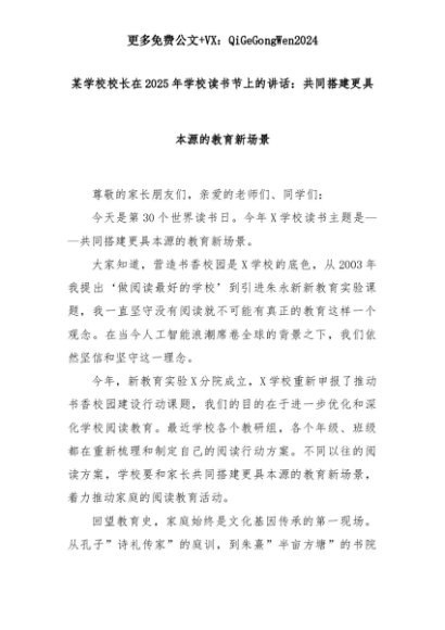 【七哥公文】2025年:某学校校长在2025年学校读书节上的讲话:共同搭建更具本源的教育新场景+更多免费公文+VX:QiGeGongWen2024+更多免费公文+VX:QiGeGongWen2024