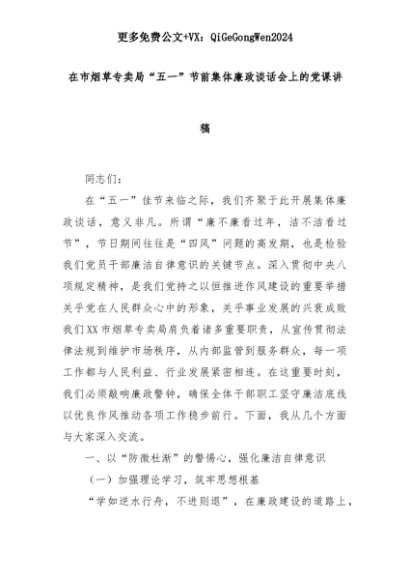 【七哥公文】2025年:在市烟草专卖局“五一”节前集体廉政谈话会上的党课讲稿+更多免费公文+VX:QiGeGongWen2024+更多免费公文+VX:QiGeGongWen2024