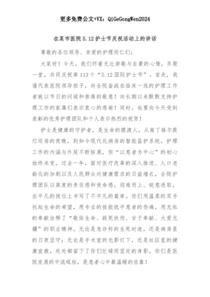 【七哥公文】2025年:在某市医院5.12护士节庆祝活动上的讲话+更多免费公文+VX:QiGeGongWen2024+更多免费公文+VX:QiGeGongWen2024