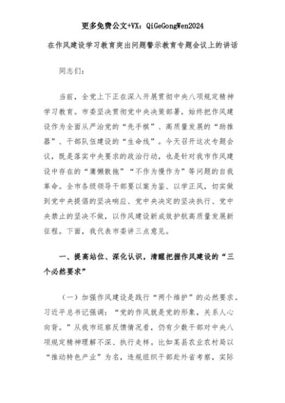 【七哥公文】2025年:在作风建设学习教育突出问题警示教育专题会议上的讲话+更多免费公文+VX:QiGeGongWen2024+更多免费公文+VX:QiGeGongWen2024