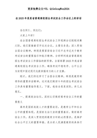 【七哥公文】2025年:在2025年某某省普通高校招生考试安全工作会议上的讲话+更多免费公文+VX:QiGeGongWen2024+更多免费公文+VX:QiGeGongWen2024