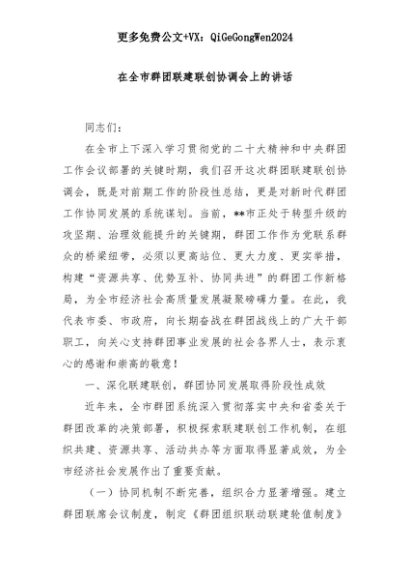 【七哥公文】2025年:在全市群团联建联创协调会上的讲话+更多免费公文+VX:QiGeGongWen2024+更多免费公文+VX:QiGeGongWen2024
