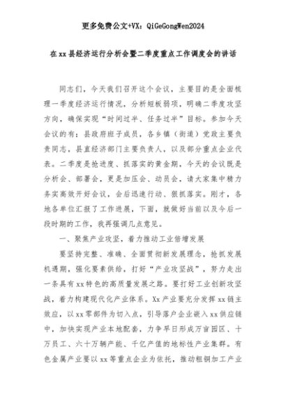 【七哥公文】2025年:在xx县经济运行分析会暨二季度重点工作调度会的讲话+更多免费公文+VX:QiGeGongWen2024+更多免费公文+VX:QiGeGongWen2024
