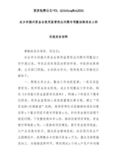 【七哥公文】2025年:在乡村振兴资金全使用监管突出问题专项整治推进会上的交流发言材料+更多免费公文+VX:QiGeGongWen2024+更多免费公文+VX:QiGeGongWen2024