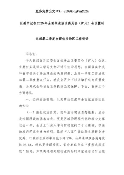 【七哥公文】2025年:区委书记在2025年全面依法治区委员会(扩大)会议暨研究部署二季度全面依法治区工作讲话+更多免费公文+VX:QiGeGongWen2024+更多免费公文+VX:QiGeGongWen2024