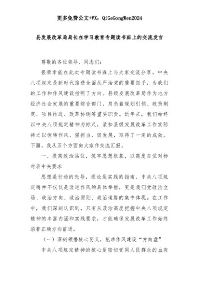 【七哥公文】2025年:县发展改革局局长在学习教育专题读书班上的交流发言+更多免费公文+VX:QiGeGongWen2024+更多免费公文+VX:QiGeGongWen2024