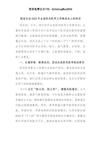 【七哥公文】2025年:副县长在2025年全县防汛防旱工作推进会上的讲话+更多免费公文+VX:QiGeGongWen2024+更多免费公文+VX:QiGeGongWen2024