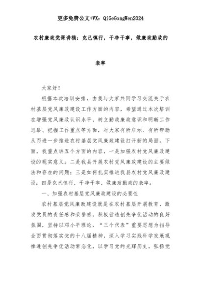 【七哥公文】2025年:农村廉政党课讲稿:克己慎行,干净干事,做廉政勤政的表率+更多免费公文+VX:QiGeGongWen2024+更多免费公文+VX:QiGeGongWen2024