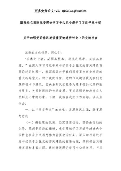 【七哥公文】2025年:副院长在医院党委理论学习中心组专题学习总书记关于加强党的作风建设重要论述研讨会上的交流发言+更多免费公文+VX:QiGeGongWen2024+更多免费公文+VX:QiGeGongWen2024