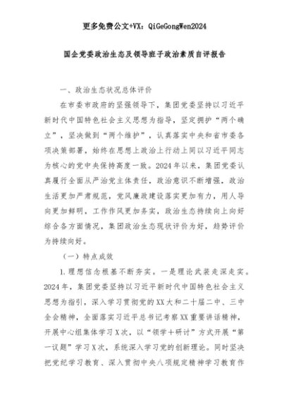 【七哥公文】2025年:国企党委政治生态及领导班子政治素质自评报告+更多免费公文+VX:QiGeGongWen2024+更多免费公文+VX:QiGeGongWen2024