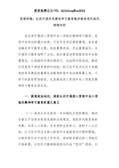 【七哥公文】2025年:党课讲稿:扎实开展作风建设学习教育稳步推进党风政风持续向好+更多免费公文+VX:QiGeGongWen2024+更多免费公文+VX:QiGeGongWen2024