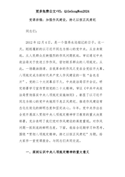 【七哥公文】2025年:党课讲稿:加强作风建设,持之以恒正风肃纪+更多免费公文+VX:QiGeGongWen2024+更多免费公文+VX:QiGeGongWen2024