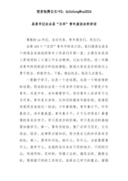 【七哥公文】2025年:县委书记在全县“五四”青年座谈会的讲话+更多免费公文+VX:QiGeGongWen2024+更多免费公文+VX:QiGeGongWen2024