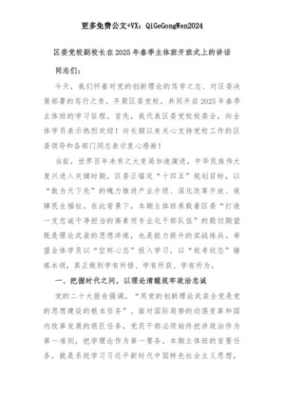 【七哥公文】2025年:区委党校副校长在2025年春季主体班开班式上的讲话+更多免费公文+VX:QiGeGongWen2024+更多免费公文+VX:QiGeGongWen2024