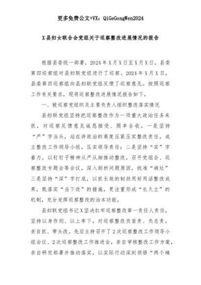 【七哥公文】2025年:X县妇女联合会党组关于巡察整改进展情况的报告+更多免费公文+VX:QiGeGongWen2024+更多免费公文+VX:QiGeGongWen2024