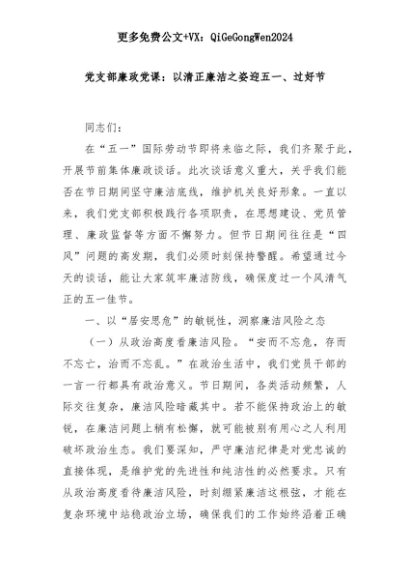 【七哥公文】2025年:党支部廉政党课:以清正廉洁之姿迎五一、过好节+更多免费公文+VX:QiGeGongWen2024+更多免费公文+VX:QiGeGongWen2024