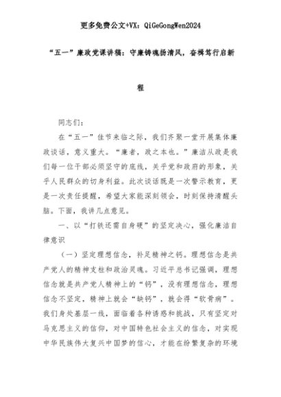 【七哥公文】2025年:“五一”廉政党课讲稿:守廉铸魂扬清风,奋楫笃行启新程+更多免费公文+VX:QiGeGongWen2024+更多免费公文+VX:QiGeGongWen2024