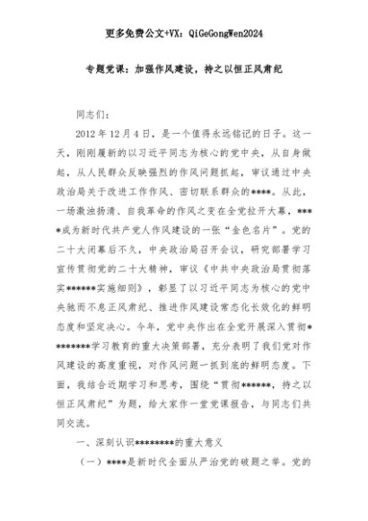 【七哥公文】2025年:专题党课:加强作风建设,持之以恒正风肃纪+更多免费公文+VX:QiGeGongWen2024+更多免费公文+VX:QiGeGongWen2024