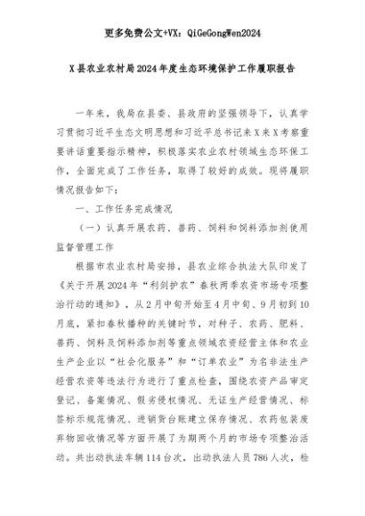 【七哥公文】2025年:X县农业农村局2024年度生态环境保护工作履职报告+更多免费公文+VX:QiGeGongWen2024+更多免费公文+VX:QiGeGongWen2024