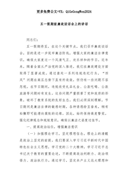【七哥公文】2025年:五一假期前廉政谈话会上的讲话+更多免费公文+VX:QiGeGongWen2024+更多免费公文+VX:QiGeGongWen2024