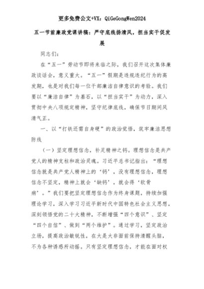 【七哥公文】2025年:五一节前廉政党课讲稿:严守底线扬清风,担当实干促发展+更多免费公文+VX:QiGeGongWen2024+更多免费公文+VX:QiGeGongWen2024