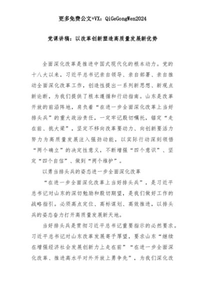 【七哥公文】2025年:党课讲稿:以改革创新塑造高质量发展新优势+更多免费公文+VX:QiGeGongWen2024+更多免费公文+VX:QiGeGongWen2024