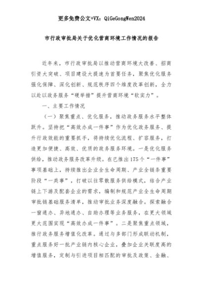 【七哥公文】2025年:市行政审批局关于优化营商环境工作情况的报告+更多免费公文+VX:QiGeGongWen2024+更多免费公文+VX:QiGeGongWen2024
