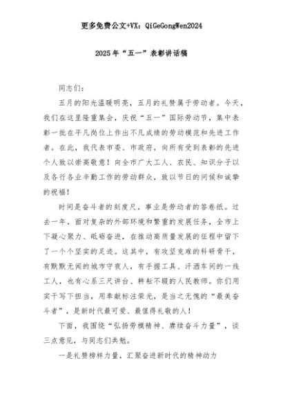 【七哥公文】2025年:2025年“五一”表彰讲话稿+更多免费公文+VX:QiGeGongWen2024+更多免费公文+VX:QiGeGongWen2024