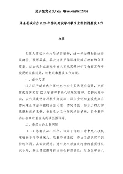 【七哥公文】2025年:某某县政府办2025年作风建设学习教育查摆问题整改工作方案+更多免费公文+VX:QiGeGongWen2024+更多免费公文+VX:QiGeGongWen2024