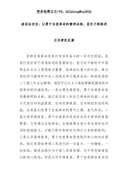 【七哥公文】2025年:座谈会发言:以勇于自我革命的精神品格,坚定不移推进正风肃纪反腐+更多免费公文+VX:QiGeGongWen2024+更多免费公文+VX:QiGeGongWen2024