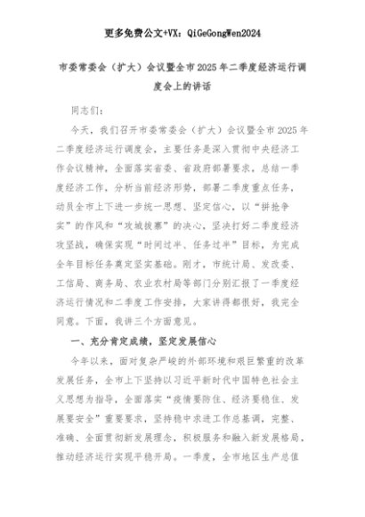 【七哥公文】2025年:市委常委会(扩大)会议暨全市2025年二季度经济运行调度会上的讲话+更多免费公文+VX:QiGeGongWen2024+更多免费公文+VX:QiGeGongWen2024