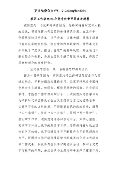 【七哥公文】2025年:社区工作者2024年优秀共青团员事迹材料+更多免费公文+VX:QiGeGongWen2024+更多免费公文+VX:QiGeGongWen2024