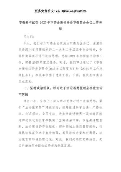 【七哥公文】2025年:市委副书记在 2025年市委全面依法治市委员会会议上的讲话+更多免费公文+VX:QiGeGongWen2024+更多免费公文+VX:QiGeGongWen2024