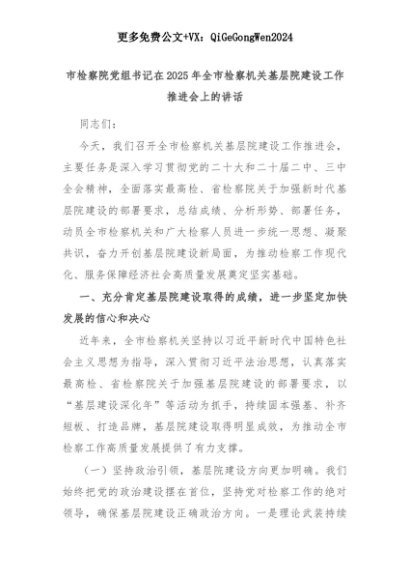 【七哥公文】2025年:市检察院党组书记在2025年全市检察机关基层院建设工作推进会上的讲话+更多免费公文+VX:QiGeGongWen2024+更多免费公文+VX:QiGeGongWen2024
