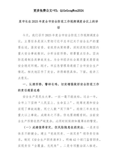【七哥公文】2025年:某市长在2025年度全市安全防范工作视频调度会议上的讲话+更多免费公文+VX:QiGeGongWen2024+更多免费公文+VX:QiGeGongWen2024