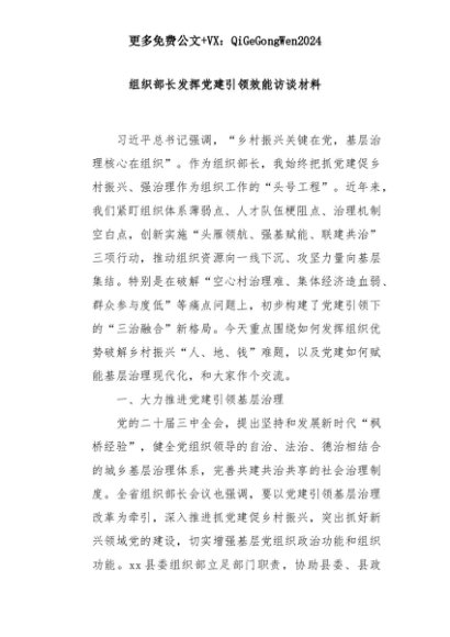 【七哥公文】2025年:组织部长发挥党建引领效能访谈材料+更多免费公文+VX:QiGeGongWen2024+更多免费公文+VX:QiGeGongWen2024