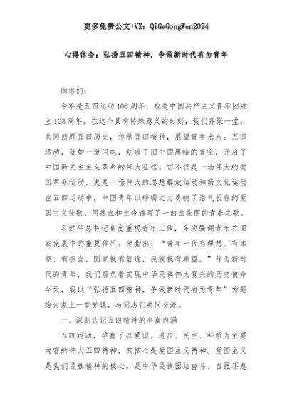 【七哥公文】2025年:心得体会:弘扬五四精神,争做新时代有为青年+更多免费公文+VX:QiGeGongWen2024+更多免费公文+VX:QiGeGongWen2024