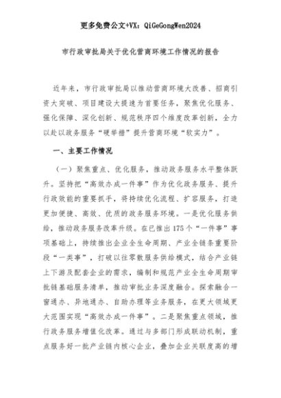 【七哥公文】2025年:市行政审批局关于优化营商环境工作情况的报告+更多免费公文+VX:QiGeGongWen2024+更多免费公文+VX:QiGeGongWen2024