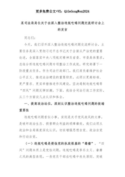 【七哥公文】2025年:某司法局局长关于在深入整治违规吃喝问题交流研讨会上的发言+更多免费公文+VX:QiGeGongWen2024+更多免费公文+VX:QiGeGongWen2024