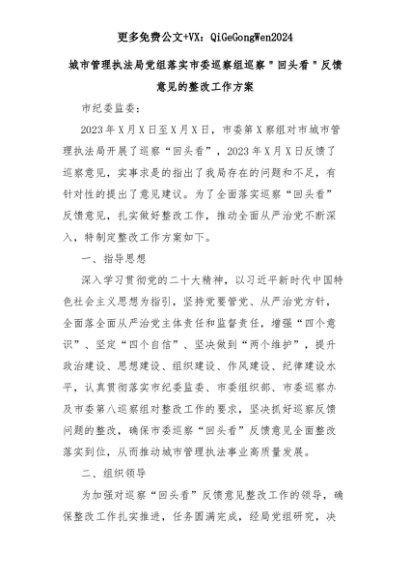 【七哥公文】2025年:城市管理执法局党组落实市委巡察组巡察"回头看"反馈意见的整改工作方案+更多免费公文+VX:QiGeGongWen2024+更多免费公文+VX:QiGeGongWen2024