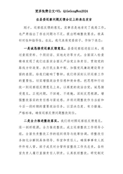 【七哥公文】2025年:在县委巡察问题反馈会议上的表态发言+更多免费公文+VX:QiGeGongWen2024+更多免费公文+VX:QiGeGongWen2024