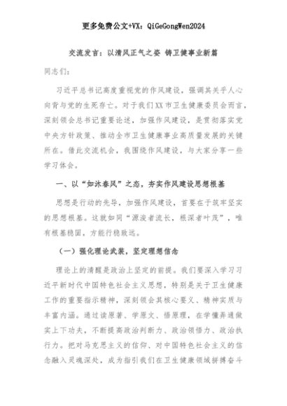 【七哥公文】2025年:交流发言:以清风正气之姿 铸卫健事业新篇+更多免费公文+VX:QiGeGongWen2024+更多免费公文+VX:QiGeGongWen2024