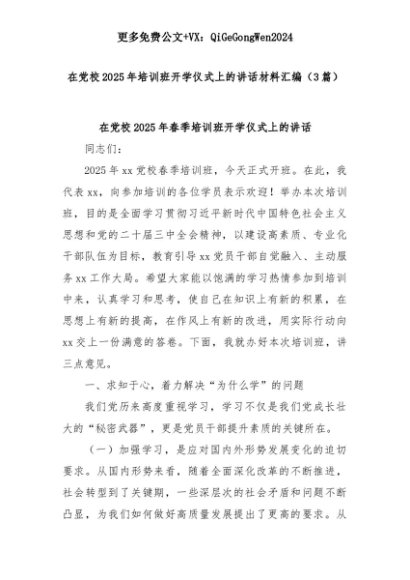 【七哥公文】2025年:(3篇)在党校2025年培训班开学仪式上的讲话材料汇编+更多免费公文+VX:QiGeGongWen2024+更多免费公文+VX:QiGeGongWen2024