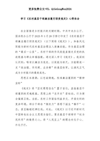 【七哥公文】2025年:学习《农村基层干部廉洁履行职责规定》心得体会+更多免费公文+VX:QiGeGongWen2024+更多免费公文+VX:QiGeGongWen2024