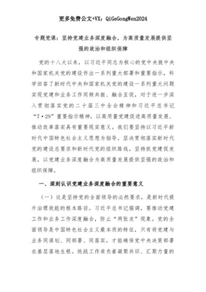 【七哥公文】2025年:专题党课:坚持党建业务深度融合,为高质量发展提供坚强的政治和组织保障+更多免费公文+VX:QiGeGongWen2024+更多免费公文+VX:QiGeGongWen2024