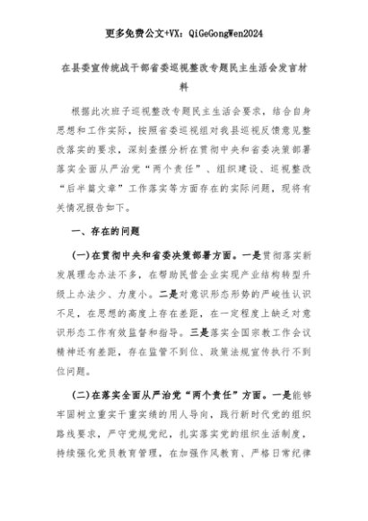 【七哥公文】2025年:在县委宣传统战干部省委巡视整改专题民主生活会发言材料+更多免费公文+VX:QiGeGongWen2024+更多免费公文+VX:QiGeGongWen2024