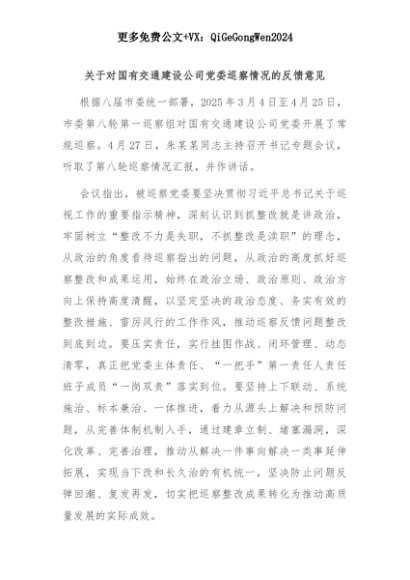 【七哥公文】2025年:关于对国有交通建设公司党委巡察情况的反馈意见+更多免费公文+VX:QiGeGongWen2024+更多免费公文+VX:QiGeGongWen2024